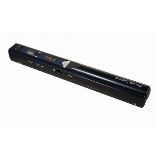 The black handheld Magic Wand Portable Scanner from VuPoint scans documents, photos, newspapers, and virtually any smooth surface and saves them to a microSD card. With a scan area of 8.27 x 98" (or up 35" inches at 900 dpi), the scanner can store any letter or legal size document or image, even at the highest resolution. Take the portable scanner with you to the library and scan what you need for later, no need to waste paper or money on photocopies. When you get home, simply connect the scanner to your computer with the supplied USB cable to transfer your scans. If you scanned a text document you can use the included OCR (optical character recognition) software to convert any printed material into editable text (Windows only; not compatible with Mac OS). The scanner runs on 2 AA batteries so there's no need to for a charger. Using standard AA batteries, the scanner can perform at least 180 color scans or 200 monochrome scans. The LCD displays the device's status and other important info. The scanner weighs only 6.9 oz (including the batteries) and is only 10 x 1.2 x 1.0", making it a great way to store documents and photos on the go.